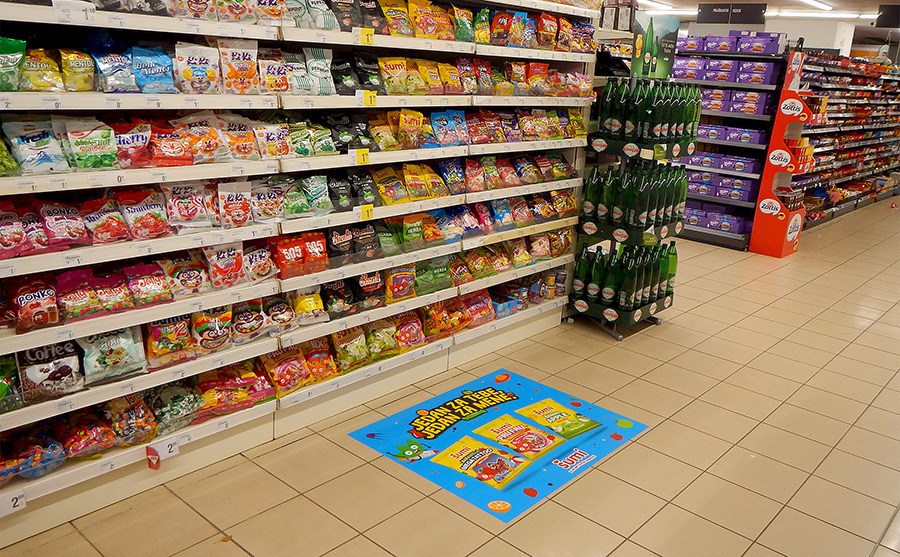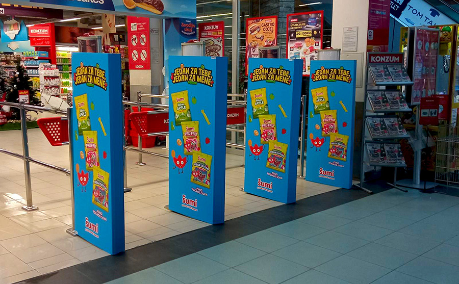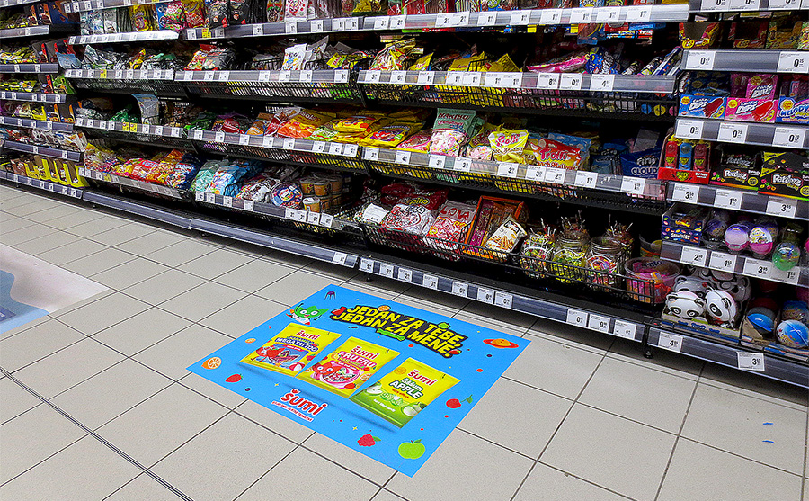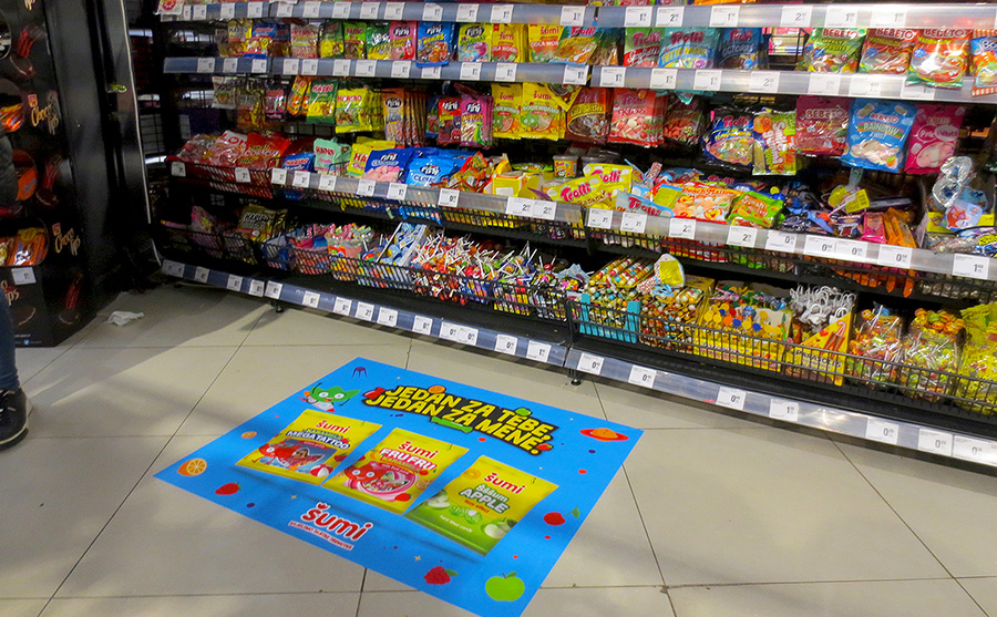 Kampanja, Podravka Šumi Formati oglašavanja senzori na ulazu, podna naljepnica i ogradice. Kampanja realizovana u trgovačkim lancima BINGO, KONZUM, KORT, NAMEX i MERCATOR. @podravka Mandis