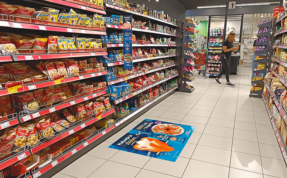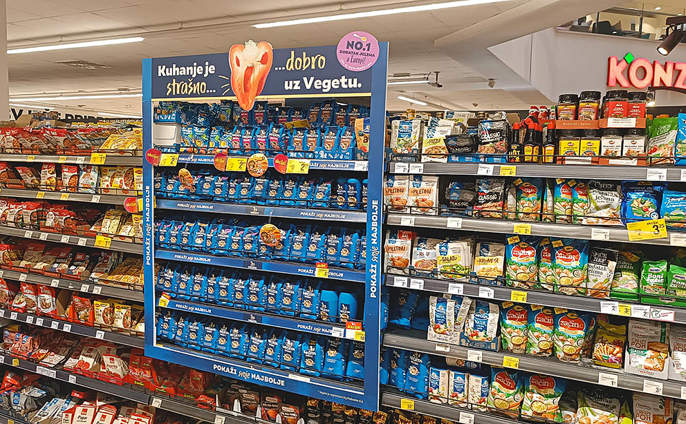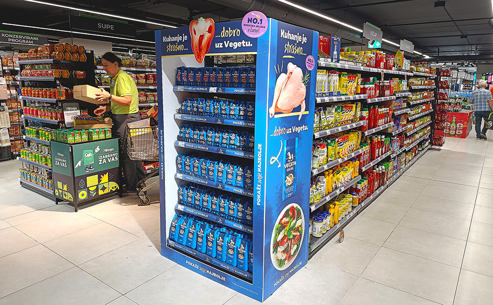Kampanja, Podravka Vegeta Formati oglašavanja, shelf frame, podna naljepnica 1 m2, gol, senzori i bocne police. Kampanja realizovana u trgovačkim lancima MERCATOR, KONZUM, NAMEX i BINGO. @podravka Mandis