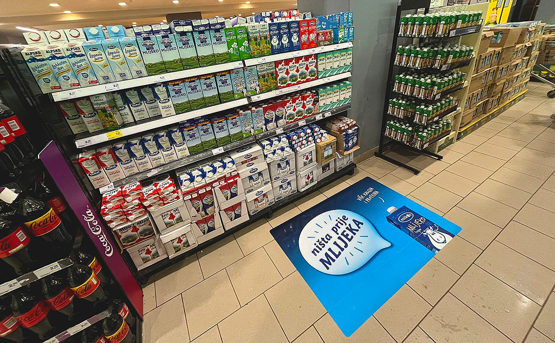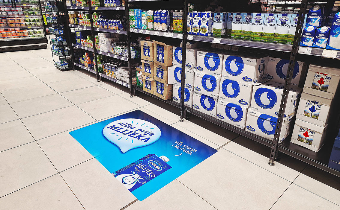 Kampanja, Milkos Mlijeko Formati oglašavanja, podna naljepnica 1 m2. Kampanja realizovana u trgovačkom lancu BINGO. @milkos Mandis