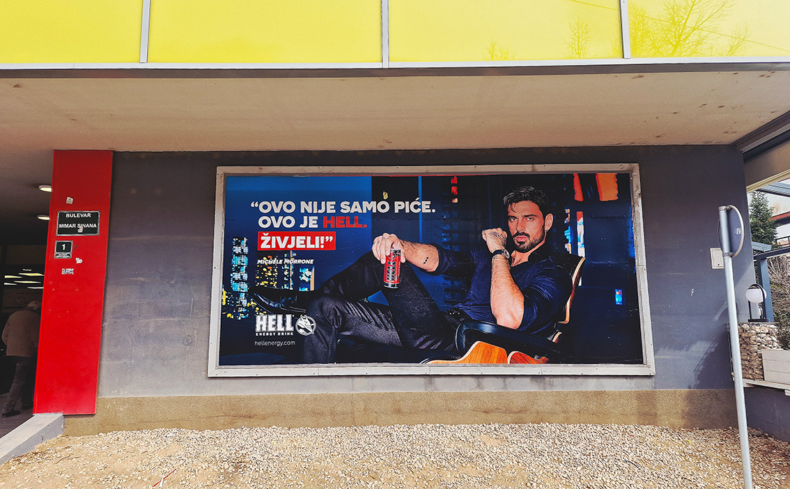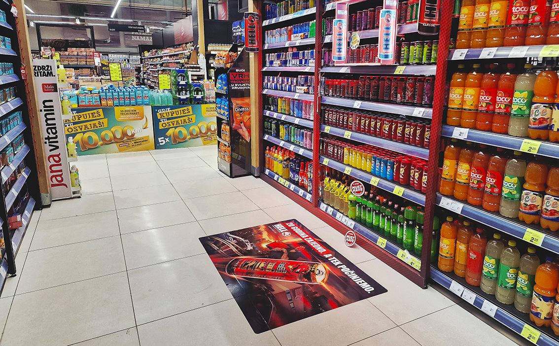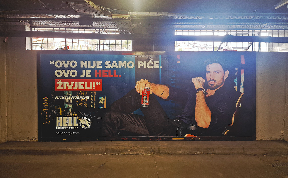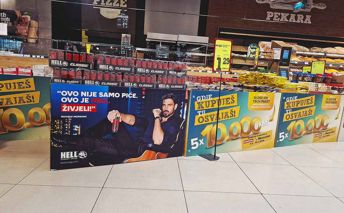Kampanja HELL Energy drink Formati oglašavanja senzori, bilbord, paletno mjesto, podna naljepnica i eskalatori. Kampanja realizovana u trgovačkim lancima MERCATOR, KONZUM i BINGO. @hell Mandis
